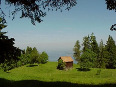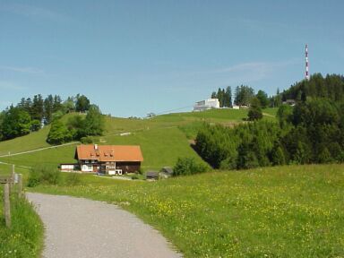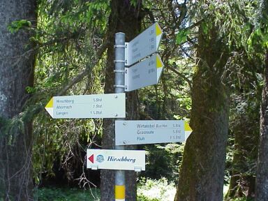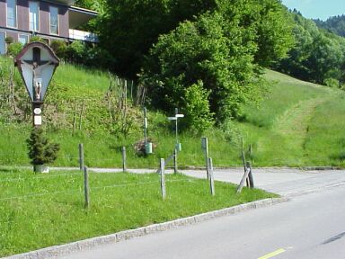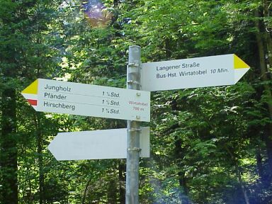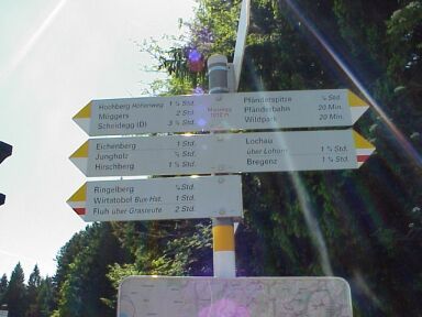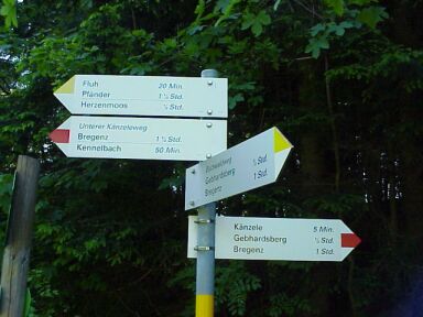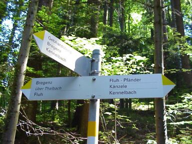 Alternative: Wenn wir dem Straßenverlauf nach links folgen kommen wir bald wieder auf die geteerte Fluherstraße, die man dort überqueren könnte, dann gehts hinunter und wieder hinauf zur Fluh. Wir biegen bei der Kehre jedoch rechts und gleich wieder links auf einen schmalen Wanderweg ab. Die Markierung ist gelb-weiß. Die Beschilderung Fluh-Pfänder. Jetzt geht's ziemlich steil über wurzeligen Untergrund Richtung Fluh hinauf. |